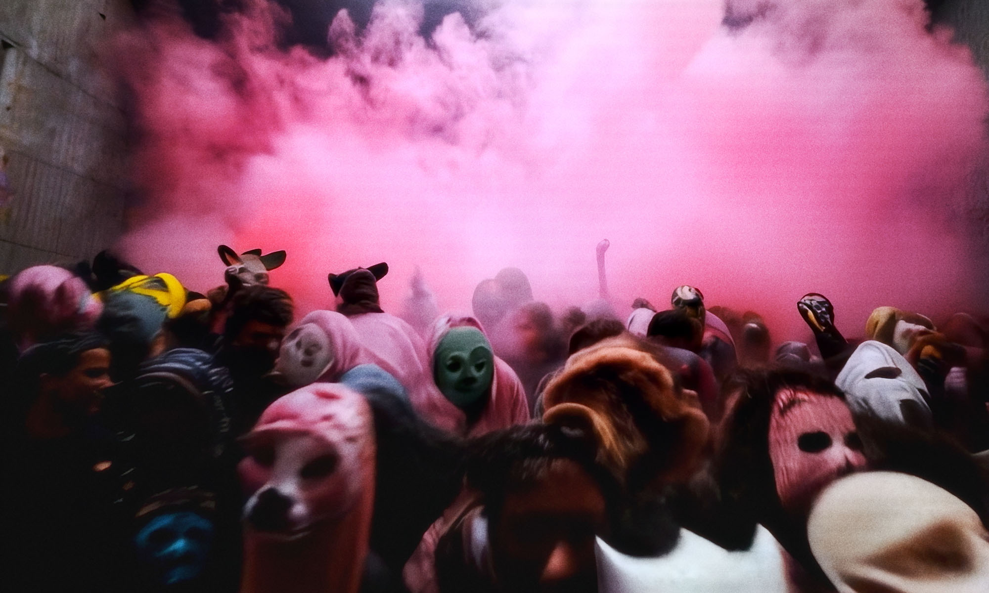 The video plunges masked figures into a dreamlike sequence of night-time riots, large demonstrations, illicit rooftop and basement parties, hackathons and squatter occupations, all permeated with billowing smoke. The AI-generated imagery mimics the gaze of drones, the cold eye of surveillance cameras and the immediacy of live action. Côme Lart uses this technology to tap the vast online archive of demonstrations and activist subcultures, with their flags, flares, clothing, scarves, smoke bombs and collective unrest. Both recognisable and disorientating, some moments are so uncannily real that the work is as unsettling as it is captivating, recalling Juan Obando’s They / Them, also on view in this space.