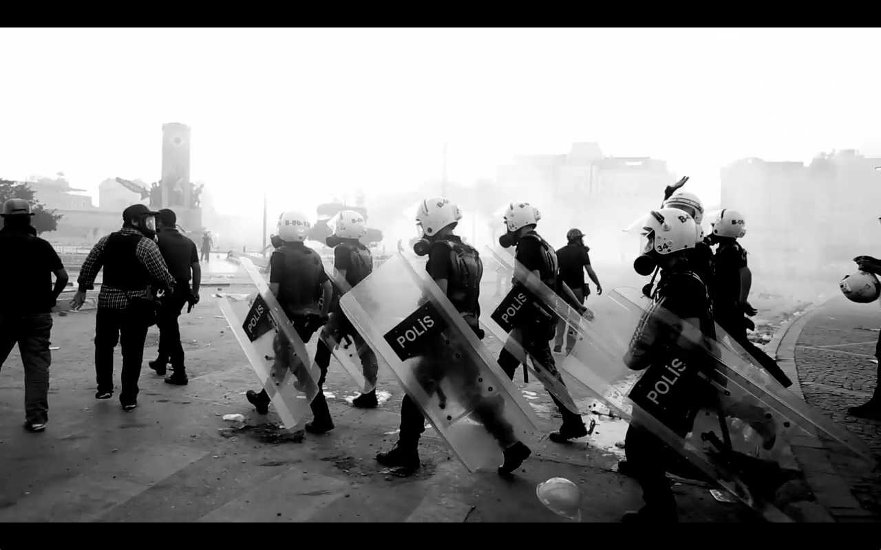Filmed through the eye of a news and documentary journalist, Witnessing Gezi has a visual language with a distinctly different tone to many of the works in PROTEST. Though fully immersed in events, Özmen strives to maintain professional neutrality. Aided by his press credentials, his impartial gaze draws us deep into the throng, bringing us face to face with demonstrators and Turkish riot police. The high-contrast black-and-white footage imparts a film noir sensibility that, even in its most intense moments, frames activists and riot police with equal weight.
