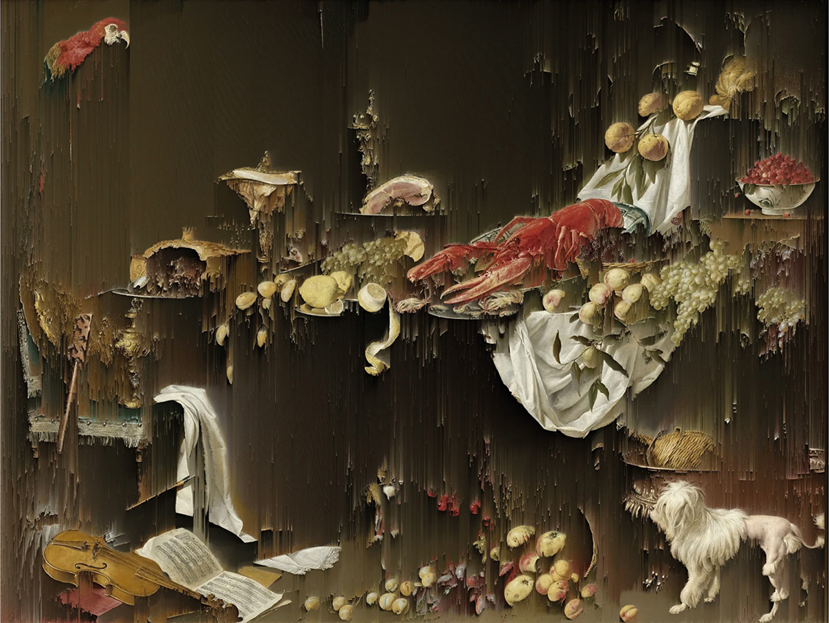 Banquet Still Life (After Adriaen van Utrecht) by Gordon Cheung reimagines the pronk still life – a Dutch still life genre that depicts luxury and abundance – as a digital hallucination. Using a sorting algorithm, he deconstructs and reorders the pixels of an image of Adriaen van Utrecht’s baroque tableau into a ghostly digital apparition. A scene unfolds from the legendary utopia, the Land of Cockaigne, featuring a lavishly set table, overflowing with lobster, grapes, and gilded tableware. This banquet slowly sinks into a digital maelstrom, its edges dissolving into trembling pixels, as if the very fabric of reality is slipping away.