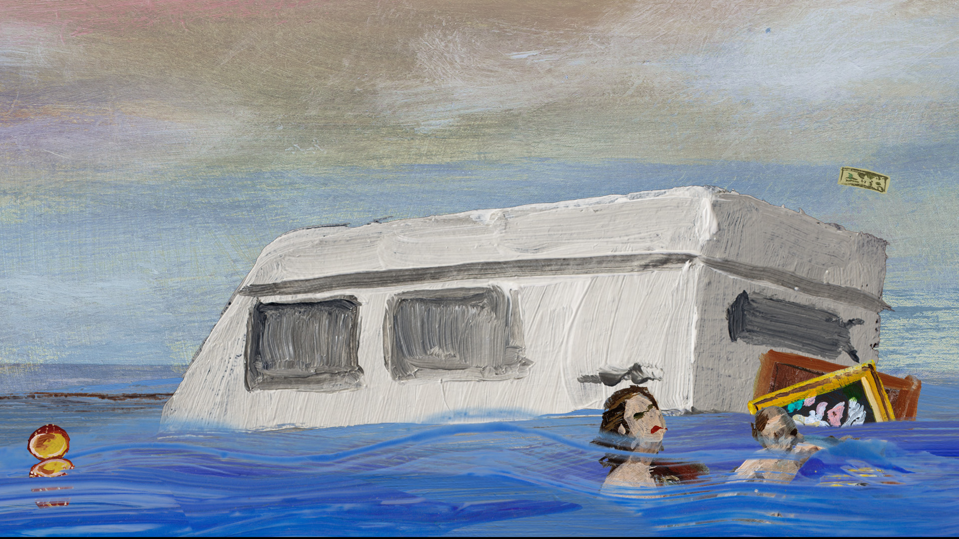 Jacco Olivier brings his distinctive playful style to the work. Rapid brushstrokes depicting flowing water fill the house, creating a fluvial world where objects merge into painterly abstractions. The continuous loop of the sequence resonates with the perpetual cycles of life and water.