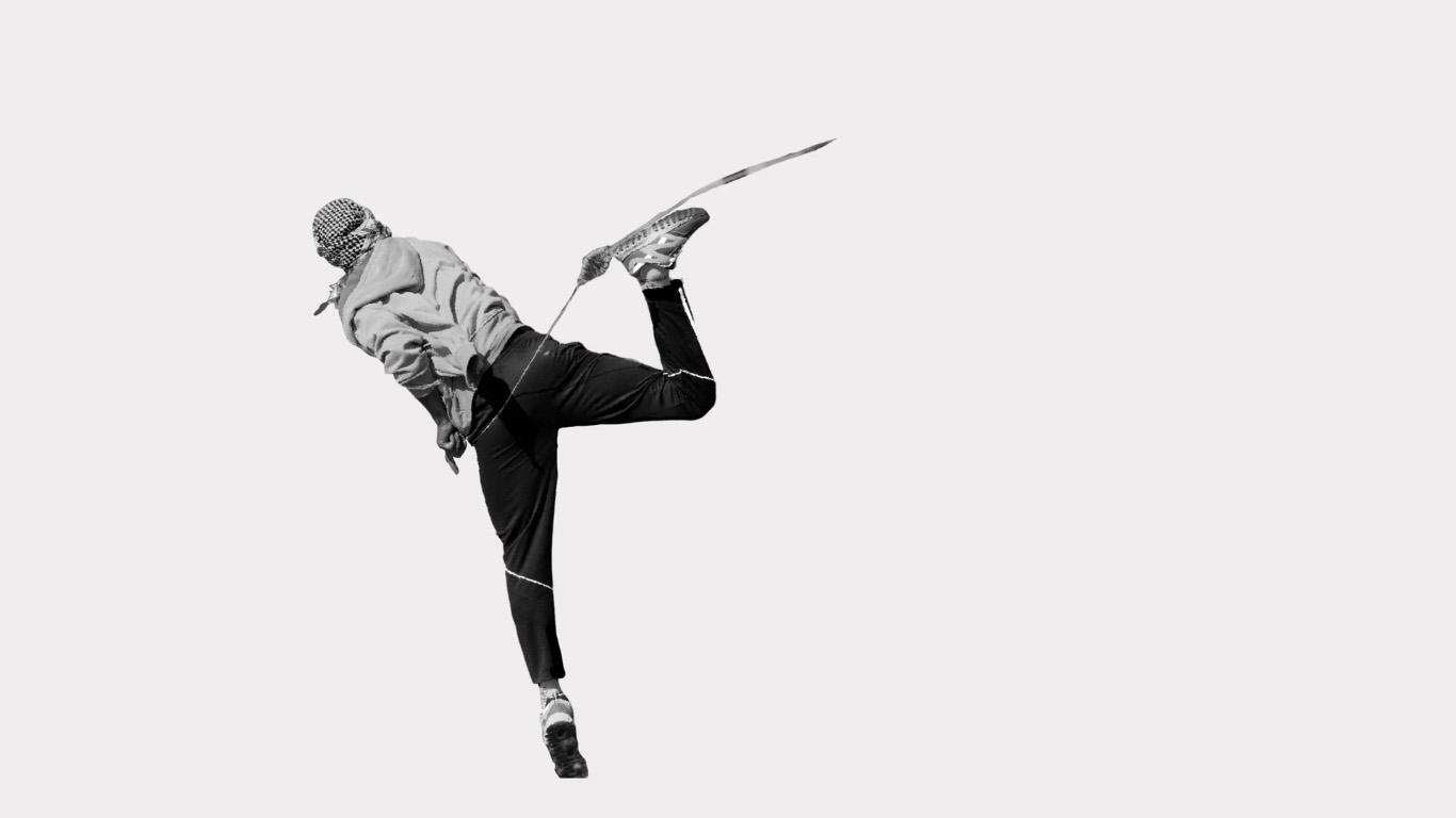 Bodies in Motion grew out of the Palestinian Intifada of 2015–16. In this video, Palestinian-Canadian artist Rehab Nazzal uses hundreds of isolated film frames of demonstrators from the West Bank. She transforms them into black silhouettes against a white background, then reanimates them in stop motion so the familiar imagery of the stone throwers takes on a universal quality. At intervals, the silhouettes shift into halftone black-and-white images recognisable as press photographs of young Palestinian protesters. Through these transitions, the imagery moves from the real to the symbolic, from moments of history to the urgency of the present, from the local to the universal.