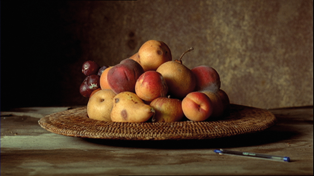 A wicker basket filled with plump peaches, pears, apples, and grapes sits alongside a plastic ballpoint pen, set against a subdued, umber-toned background. The ripe fruit seems irresistible until a veil of mould gradually engulfs it. Colours fade, skins shrivel, and what remains is a grey, formless sludge. Meanwhile, the pen remains motionless, unaffected, and pristine.